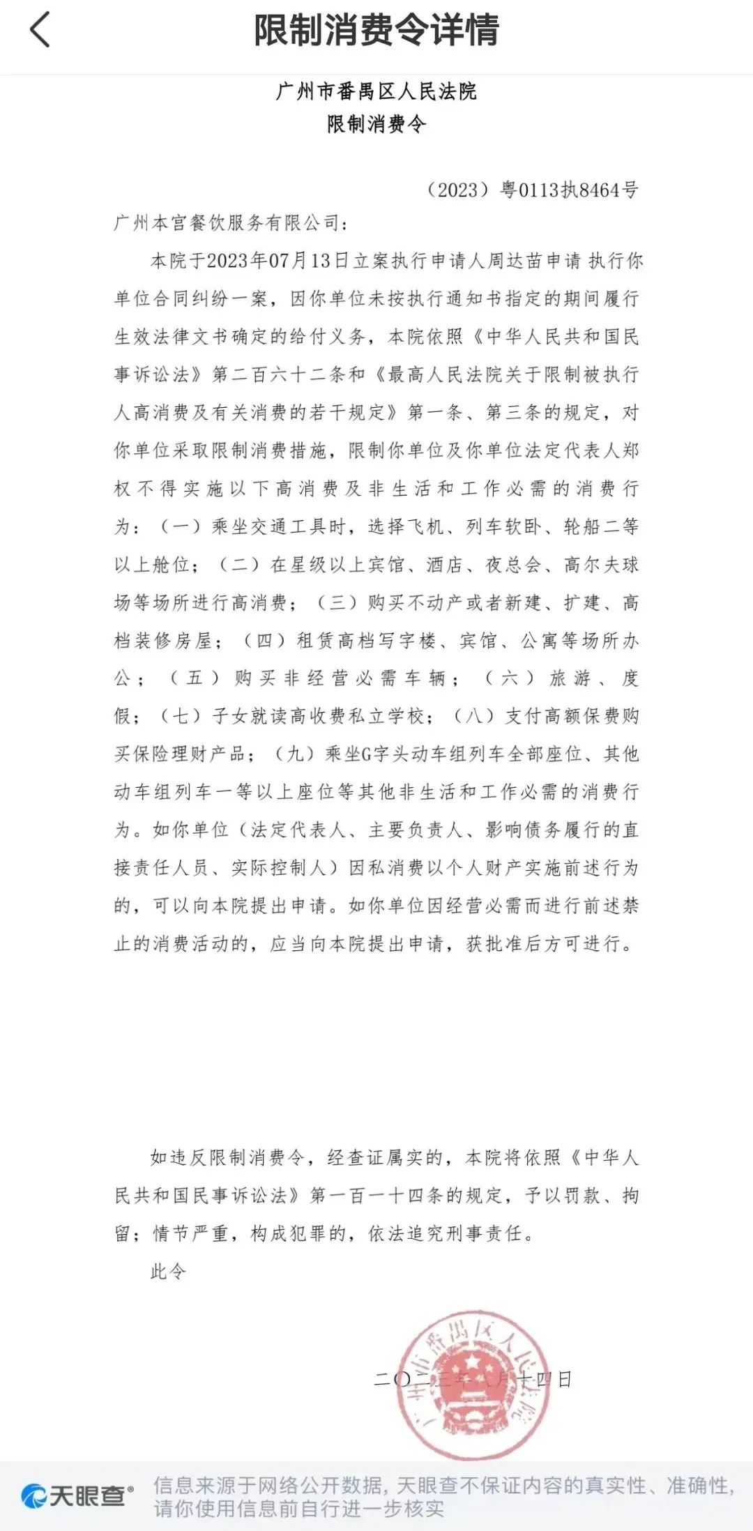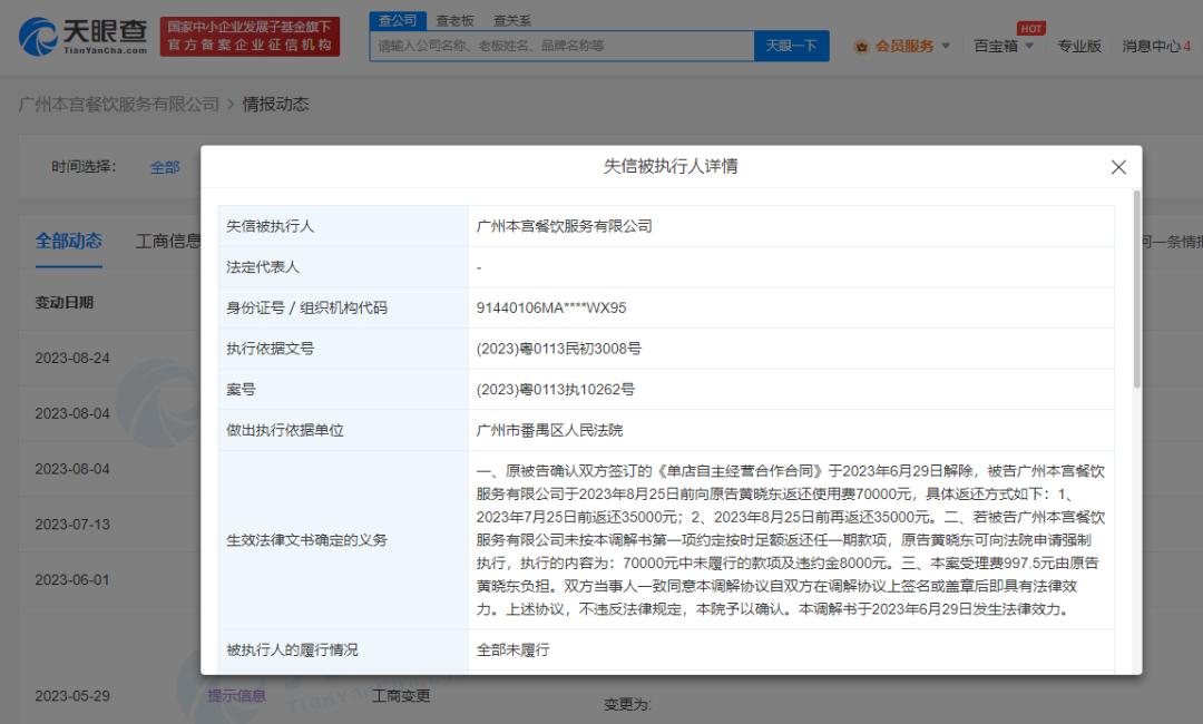 因被告本宫餐饮公司未履行约定,8月4日,黄某某向法院申请强制执行,9月6日,本宫餐饮公司法人代表郑权被限制消费,9月15日,本宫餐饮公司被列为失信被执行人。