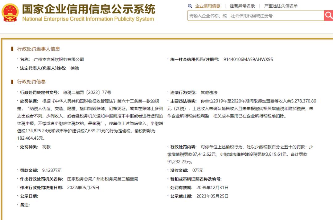 本宫餐饮因隐瞒加盟费等收入超527万元,被认定偷税超18万元,2022年,被国家税务总局广州市税务局第二稽查局罚款9.12万元。
