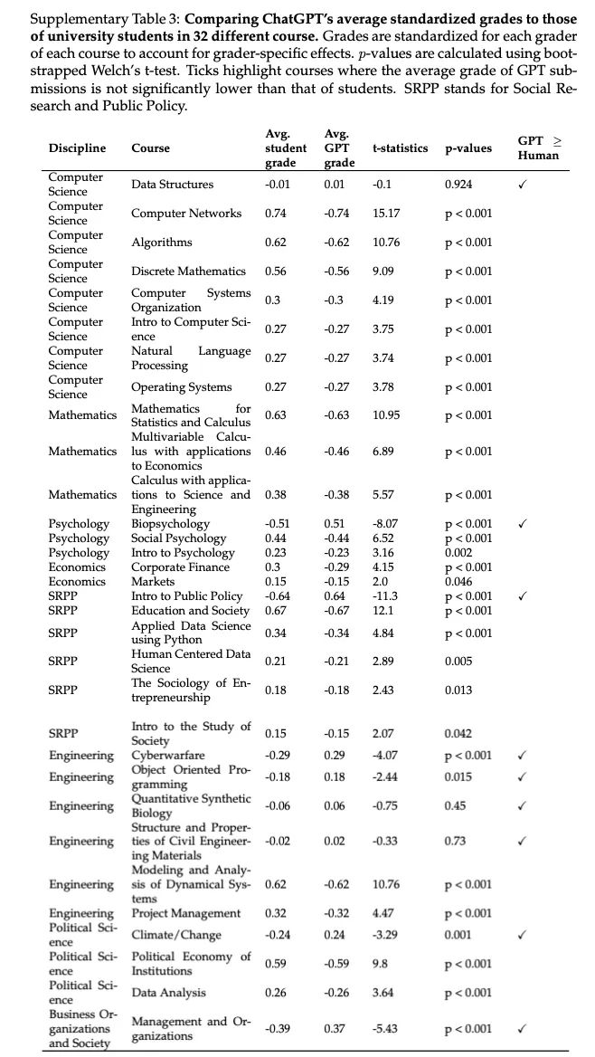 研究人员通过将ChatGPT与来自8个学科的32门大学水平课程的学生的表现进行比较,来研究ChatGPT作为抄袭工具的潜力。