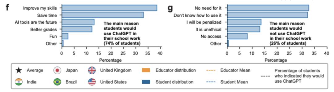 可以看出,来自巴西和印度的学生比来自美国的学生更有可能使用ChatGPT,而来自日本的学生使用ChatGPT的可能性要小得多。