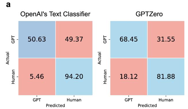 OpenAI的Text Classifier将5%的学生提交的内容错误地判定为人工智能生成的,而ChatGPT的49%的提交内容错误地判定为人工生成的。GPTZero的假阳性率较高(18%),假阴性率较低(32%)。