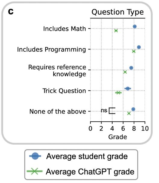 同样,研究人员发现ChatGPT和学生之间最大的成绩差距是与数学相关的问题,其次是那些刁钻的问题。就目前而言,人类似乎在这些领域的表现优于ChatGPT。