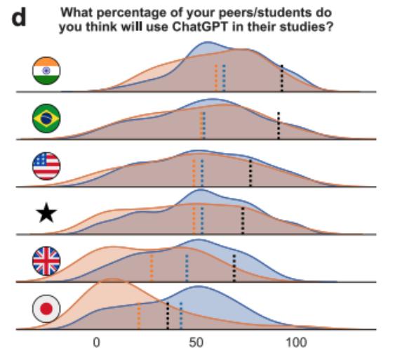 「考虑到你下学期的学习,你会使用ChatGPT来帮助你的学习吗?」 正如第四行所示,代表了五个国家的平均反应,74%的学生表示他们会使用ChatGPT(黑线),而教育工作者和学生都低估了这一比例。