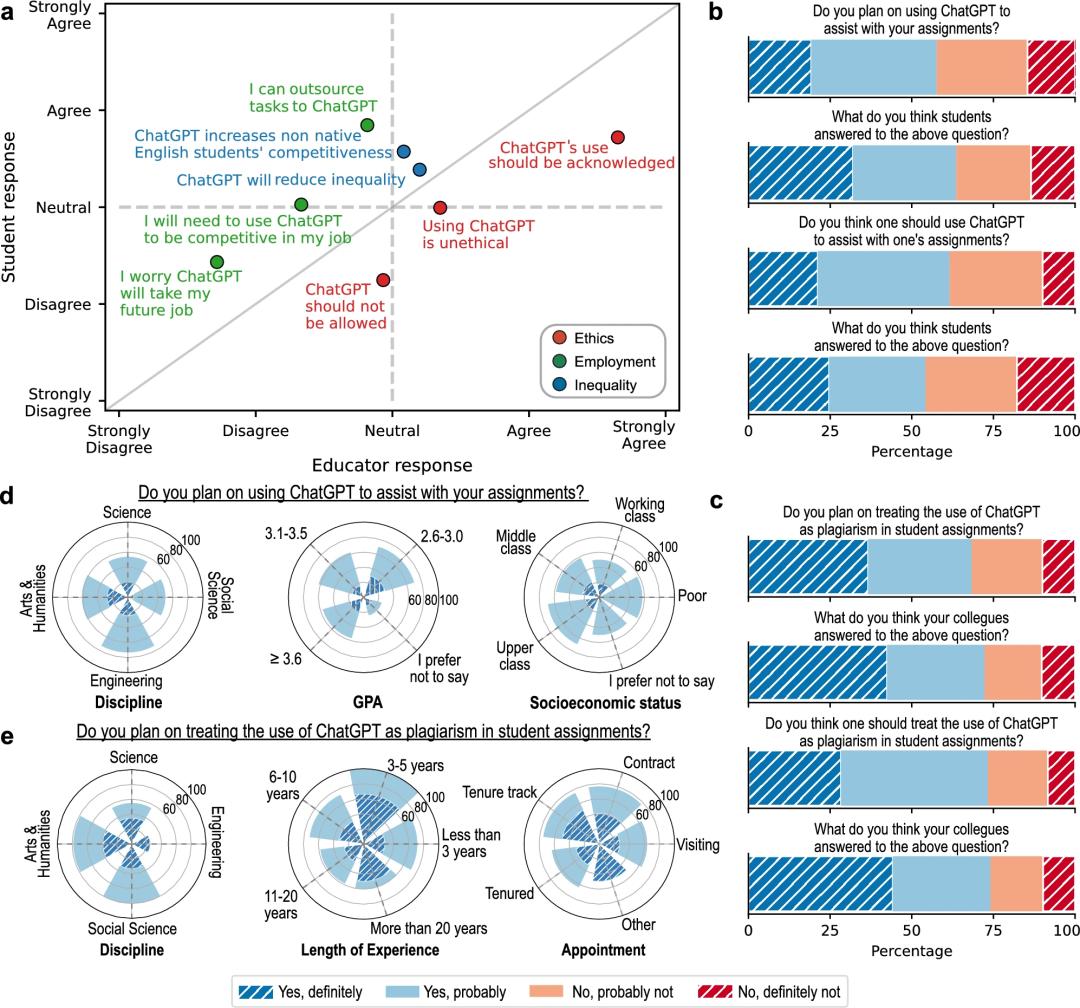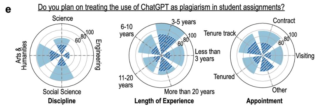 而教授们的观点体现在上图中。如图所示,除了工程专业以外的其他学科,大部分教师都认为在作业中使用ChatGPT是抄袭。