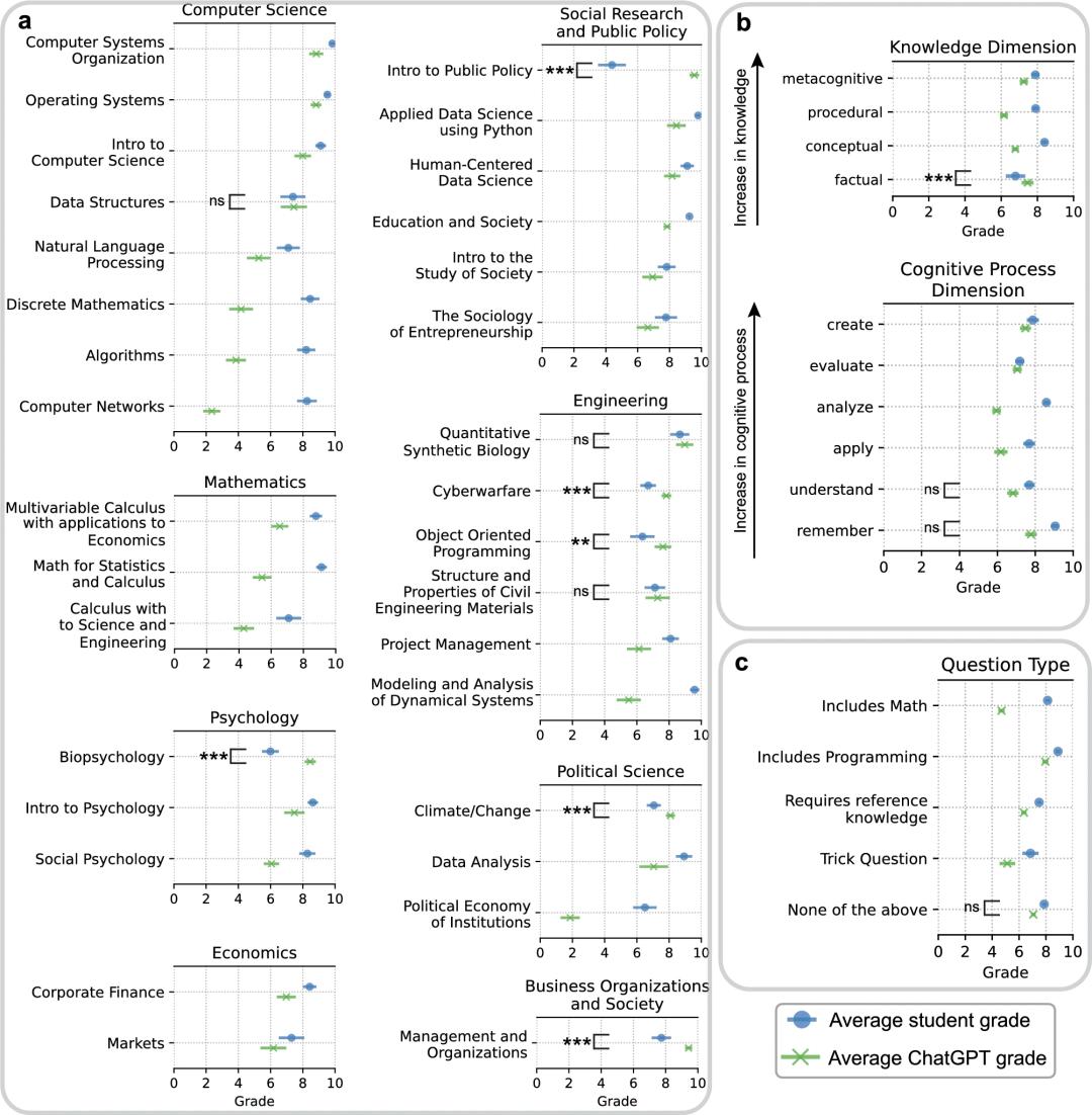 研究人员发现,ChatGPT的表现与32门课程中的9门课程的学生相当,甚至更好。