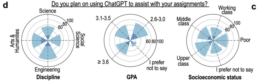 从不同学科来看,所有四个学科的大多数学生都表示他们计划使用ChatGPT。