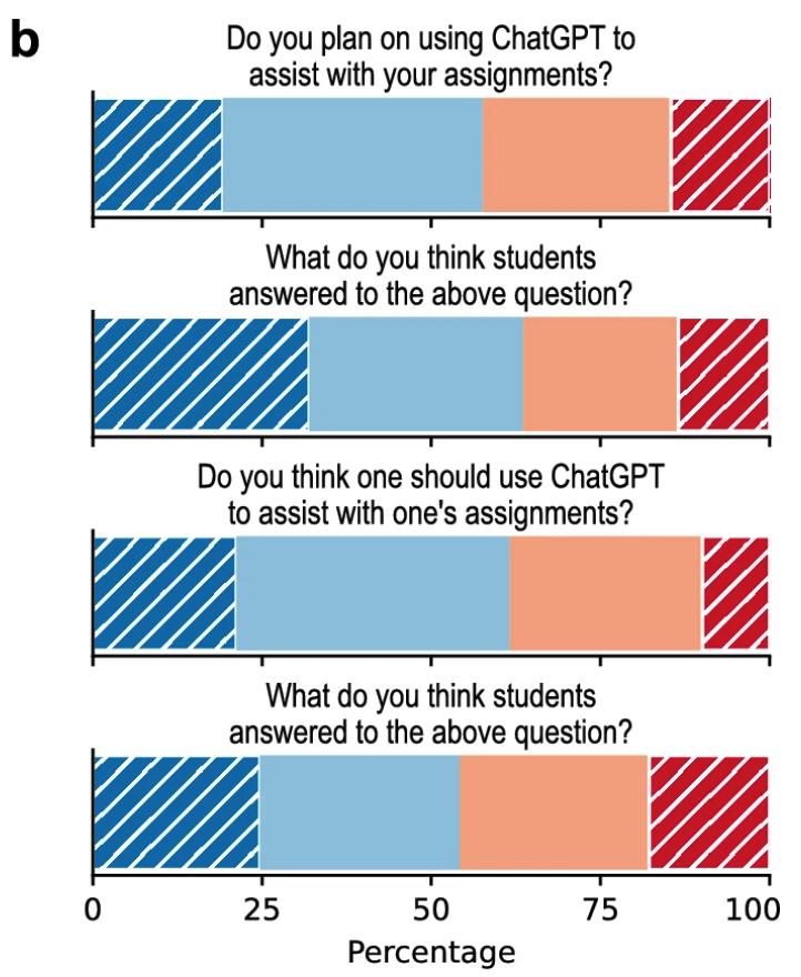 大多数学生计划使用ChatGPT来辅助他们的作业(57%),并期望他们的同龄人使用它来达到这个目的(64%)。此外,大多数人认为应该使用ChatGPT(61%),并期望他们的同龄人认为应该使用ChatGPT(55%)来协助完成作业。