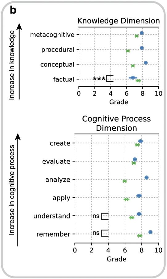 有趣的是,在要求高水平知识和认知过程的问题上,与要求中级水平的问题相比,ChatGPT和学生之间的表现差距要小得多。