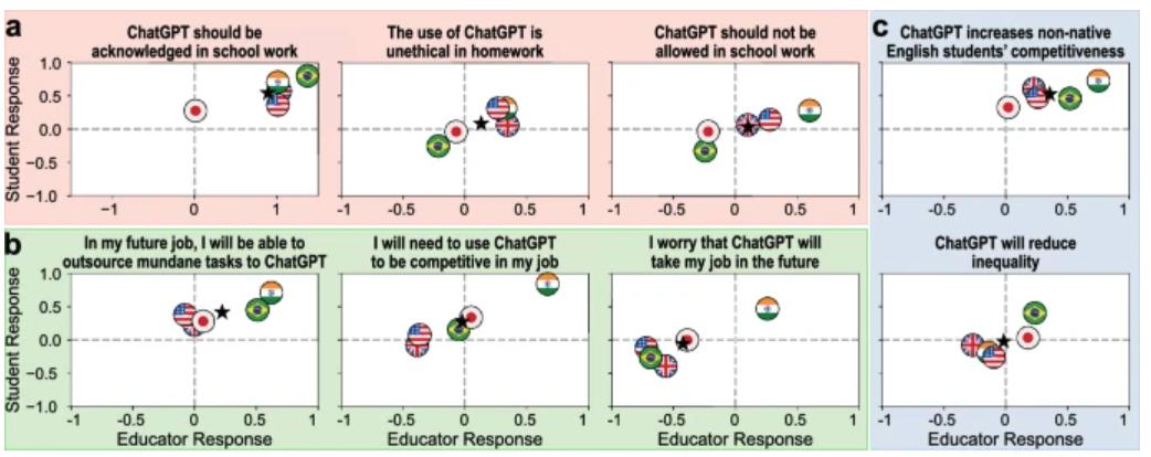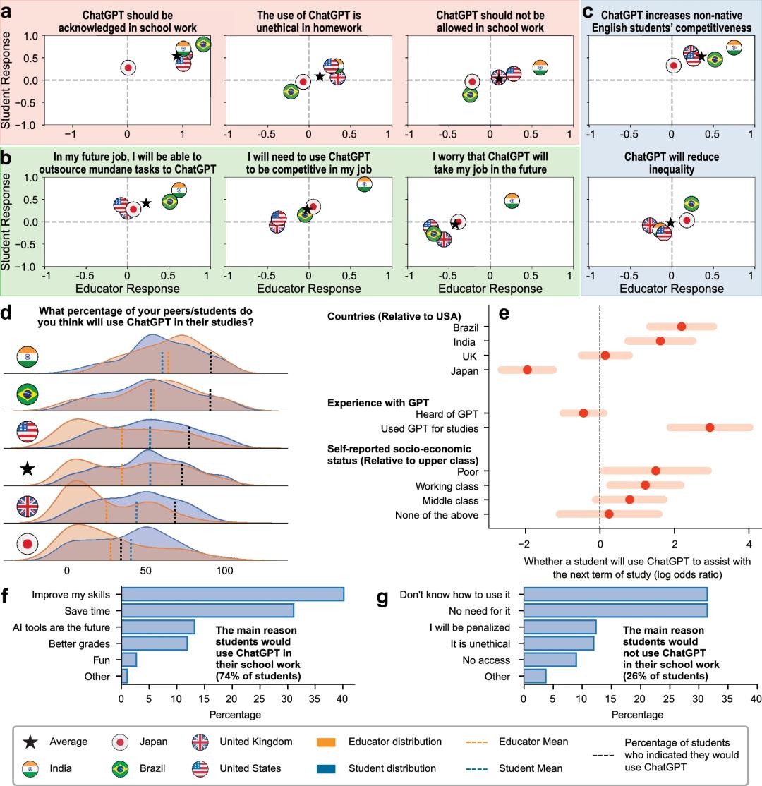 为了更好地了解学生和教育工作者对ChatGPT的效用以及使用ChatGPT所产生的道德和规范问题的看法,研究人员调查了来自五个国家的参与者:巴西、印度、日本、英国和美国。