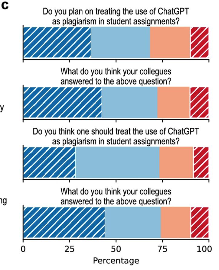 大多数教授计划将使用ChatGPT视为剽窃(69%),并期望其他人也这样做(71%)。