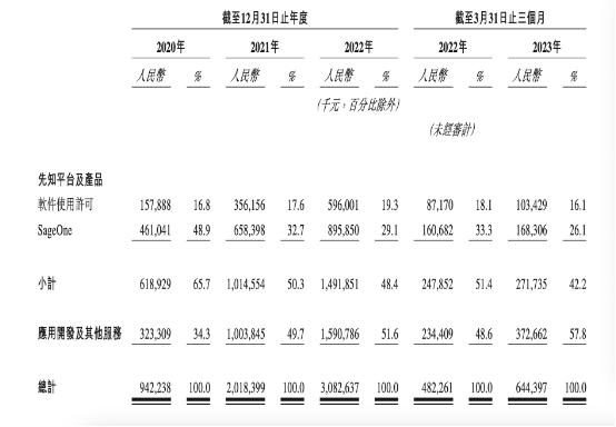 从上图不难看出,从2020年到2023年一季度,第四范式应用开发及其他服务收入占比在逐渐超过先知平台及产品。