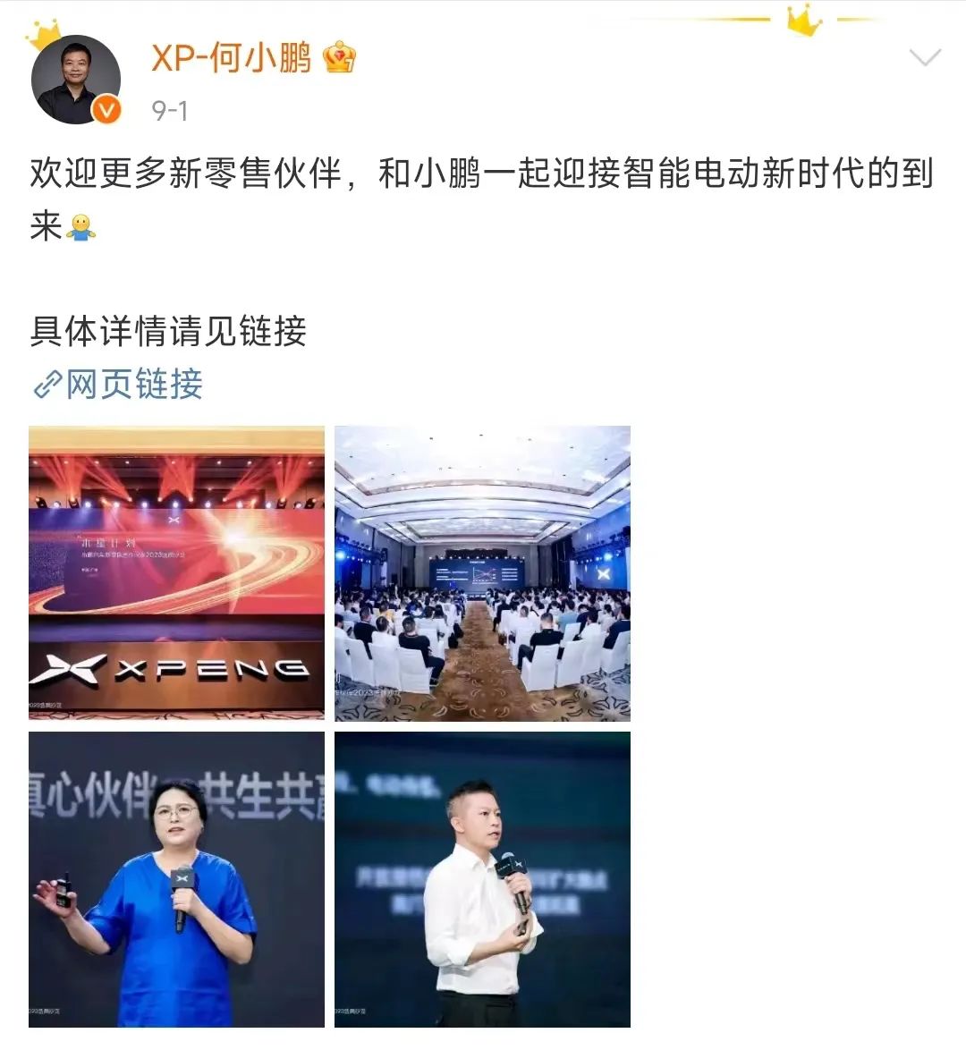 9月1日,何小鹏在微博上发消息称:"欢迎更多新零售合作伙伴加入,与小鹏一同迎接智能电动新时代的来临。"