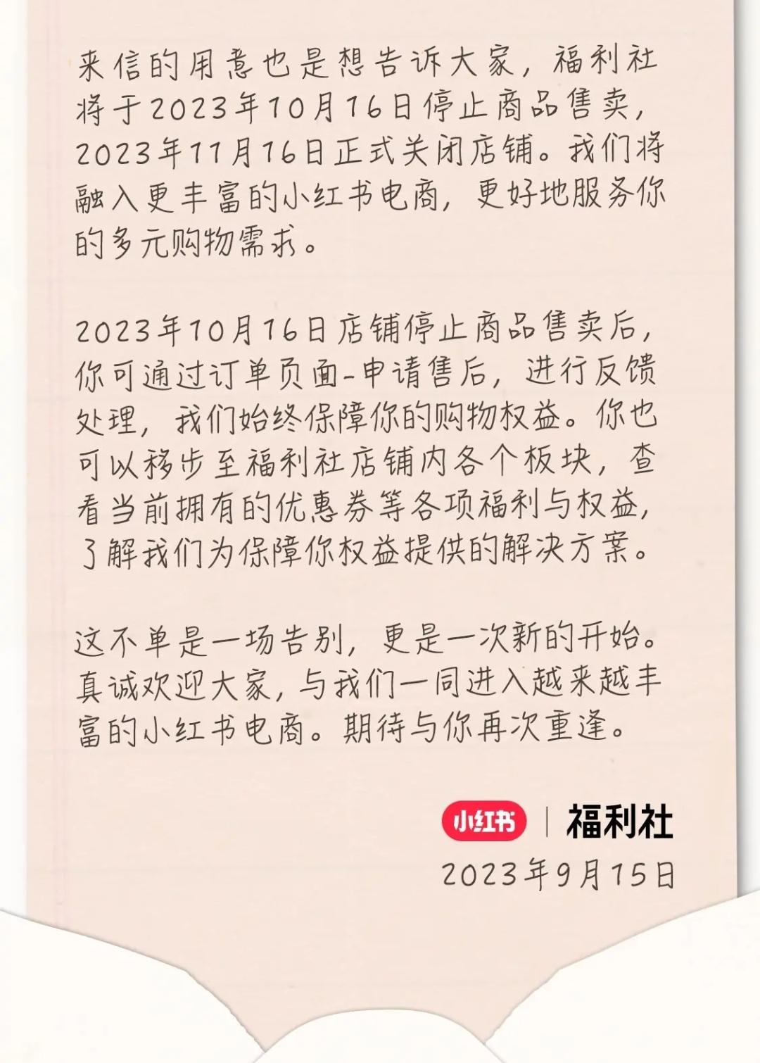 9月15日,小红书再次宣布将关闭经营9年的自营店铺“福利社”,将于10月16日停止商品售卖,11月16日正式关闭店铺。