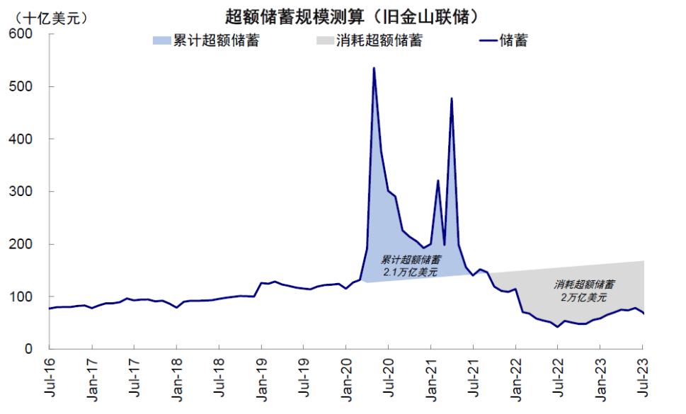 在油价连续两个月反弹的背景下,剔除食品和能源成本的核心CPI同比上升4.3%,而8月份美国通胀不仅连续第二个月同比反弹,而且超出了此前市场预期的3.6%。虽然疫情以来,美国政府的大规模财政刺激导致居民累计了超过2.3万亿美元的超额储蓄,然而随后财政退坡、居民实际收入下滑和消费活动修复都加速了居民超额储蓄的消耗。近期旧金山联储使用储蓄的绝对规模进行测算,截至2023年7月已回落至810亿美元,预计今年3季度将耗尽。