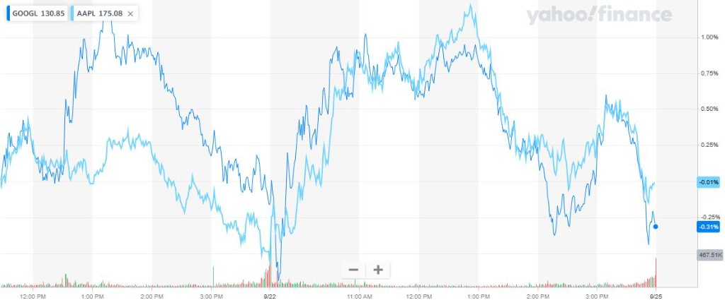 谷歌A周五涨超1%后尾盘小幅转跌,至近一个月最低。苹果涨1.8%后显著收窄至收涨0.5%。