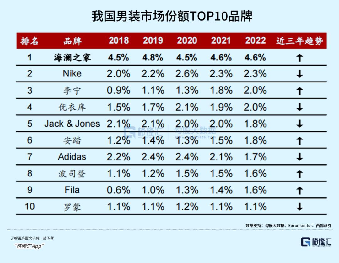 作为国内服装龙头,海澜之家连续四年蝉联A股上市海澜之家服装行业营收第一,在男装领域里,更连续九年保持国内男装市占率第一。