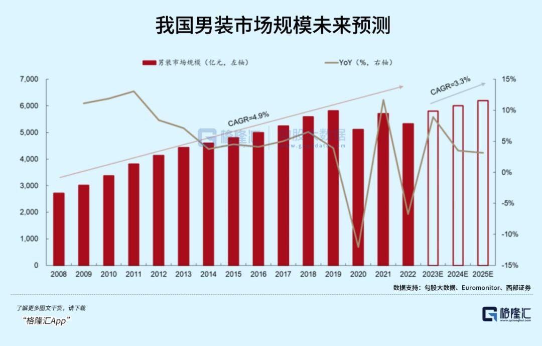 根据Euromonitor,2022 年我国男装市场规模为5323亿元,2008-2022年复合增速只有4.9%。虽然市场体量大,但增速从11年后早已断崖式下滑,想要继续保持高增长只能靠收割别人的份额,而海澜之家市占率却一直不上不下。
