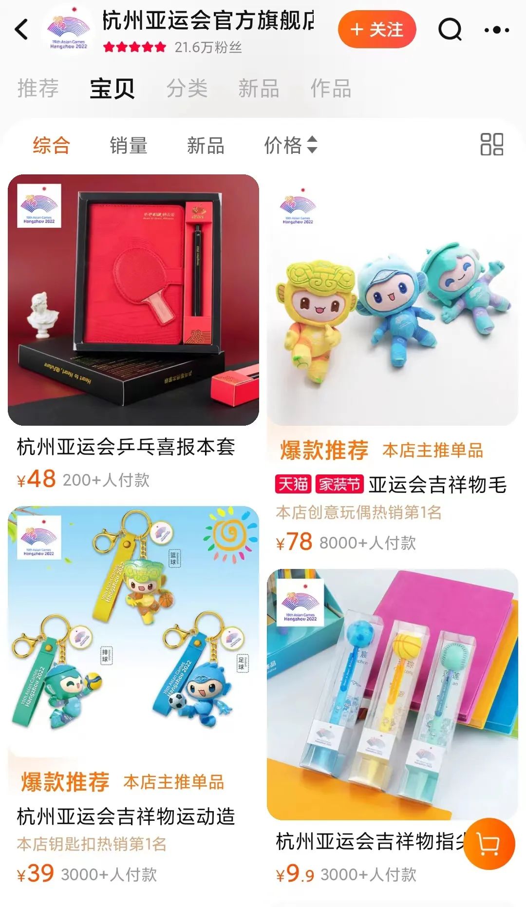 而作为杭州亚运会官方合作伙伴,阿里旗下的天猫成为亚运会唯一官方线上销售渠道,2019年12月10日,“杭州亚运会官方旗舰店”正式入驻天猫。