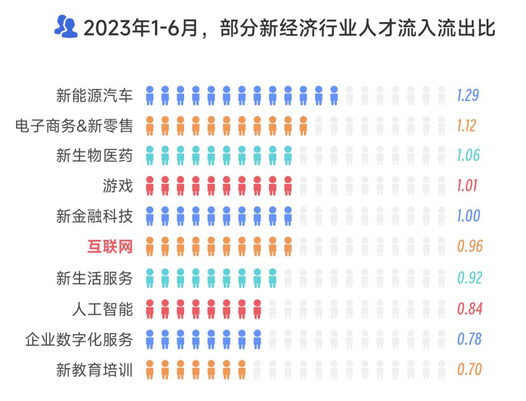 脉脉高聘人才智库发布的《2023泛互联网行业人才流动报告》显示,近3年,万人以上规模大厂人才流入流出比持续走低,从高速扩张转为局部收缩。2023年上半年,互联网行业出现明显的人才溢出现象,有超过一半的跳槽者(52.31%)进入其他行业。其中,新能源汽车行业成为热点,人才流入流出比高达1.29。