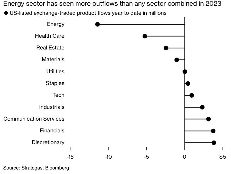 截至8月中旬,投资者年内从大约80只追踪能源行业的美国ETF中撤资近115亿美元,超过了所有其他行业ETF撤资的总和。而2020年到2022年初,这些能源类ETF曾录得近350亿美元的资金流入。
