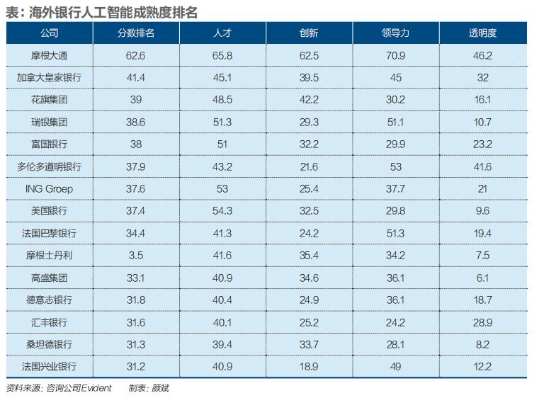 咨询公司Evident近期发布的排名显示,在海外银行中,摩根大通、加拿大皇家银行、花旗集团、瑞银集团及富国银行的人工智能成熟度(AI maturity)最高。该排名基于人才、创新、领导力和透明度的多维度比较。