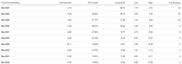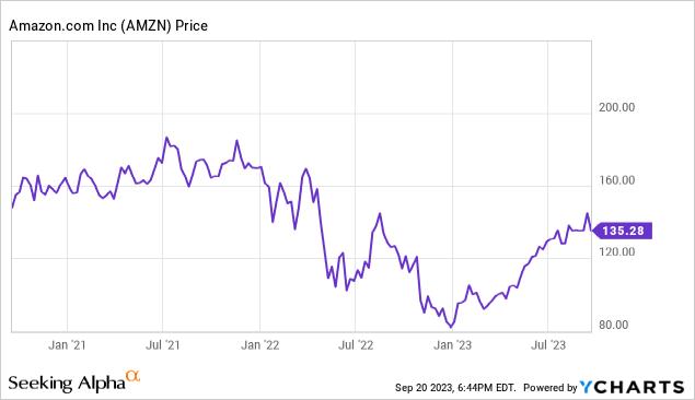 但在这种情况下,人们必须小心,避免因为亚马逊“太好”而受到惩罚。通常,对于一家公司来说,能够以高回报率进行资本投资是一件好事(甚至是一件非常好的事)。就亚马逊而言,它能够以高回报率投入大量资本,以至于侵蚀了当前的盈利能力。鉴于亚马逊凭借其对配送网络的深度投资而能够在电子商务领域取得如此主导地位,理论上投资者应该希望获得尽可能少的利润,因为这意味着更多的资本投入——这是一个讽刺的观点。为了避免因亚马逊选择积极投资其长期增长目标而受到惩罚,我选择根据长期利润率假设对该股票进行估值。基于电子商务 5% 的长期净利润率假设和 25 倍的市盈率,我对电子商务业务的估值为 5,650 亿美元。基于 AWS 恢复 18% 的收入增长、40% 的长期净利润以及 2 倍的市盈率(“PEG 比率”),我认为该部门的估值为 1.2 万亿美元。总之,这意味着每股估值为 172 美元,意味着与持续的年度增长相匹配的稳健的多重扩张上行潜力。