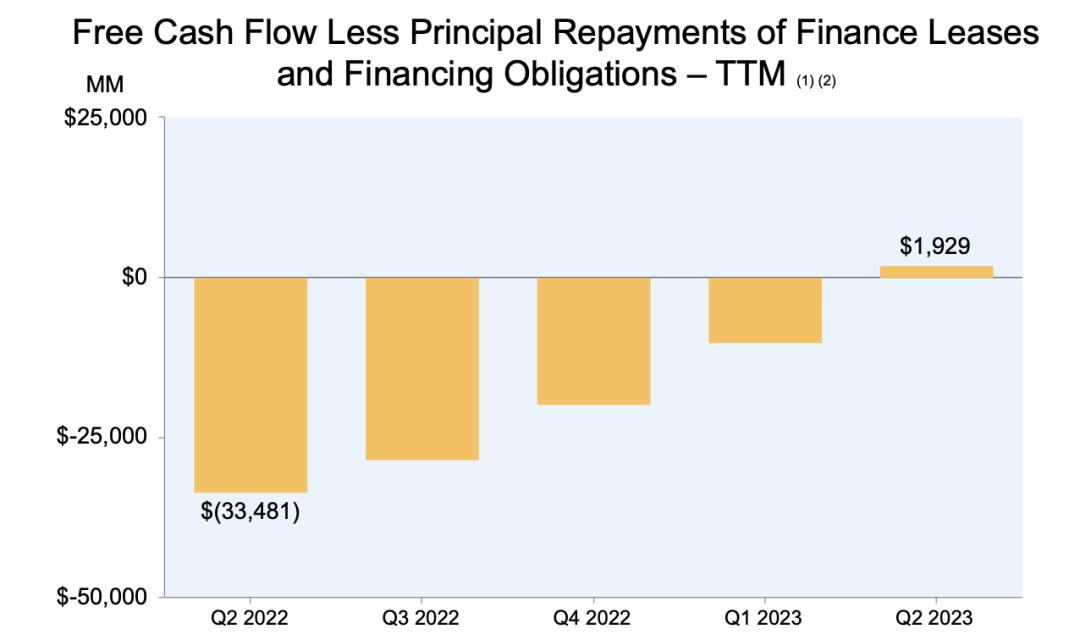 本季度和最近几个季度的强劲复苏使亚马逊最终能够在过去 12 个月的基础上实现正的自由现金流生成。