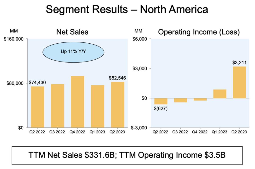 利润增长的主要推动力是北美(电子商务)领域利润率的持续提高。该细分市场的利润率于 2022 年第一季度触底,但已连续 5 个季度实现连续增长。