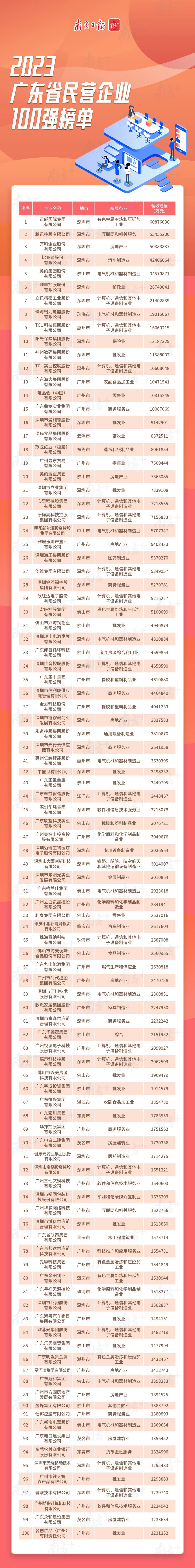 据悉,2023广东省民营企业100强入围门槛为123.13亿元,其中2022年营业收入超过4000亿元的企业有4家,超1000亿的有15家,超200亿的有64家。