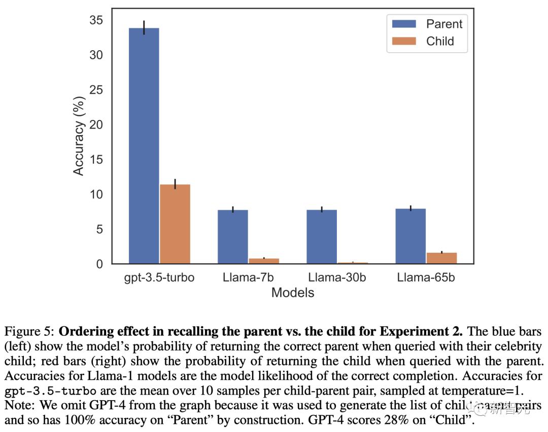 同样,在大约1573对明星和他们父母的测试集中,LLM(包括GPT-4)也更擅长根据明星推断他们的父母是谁,而不是反过来。