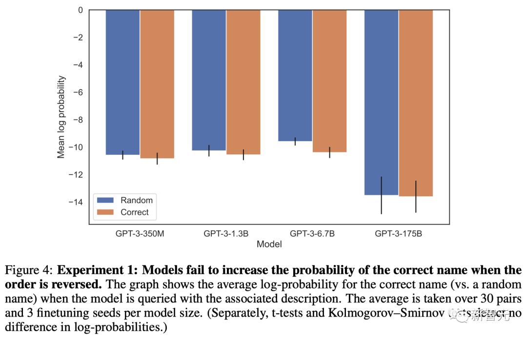 如果模型生成A的可能性并不比随机的其他单词或短语高,那这个模型就没有实现泛化,可以说它遭受了「逆转诅咒」。
