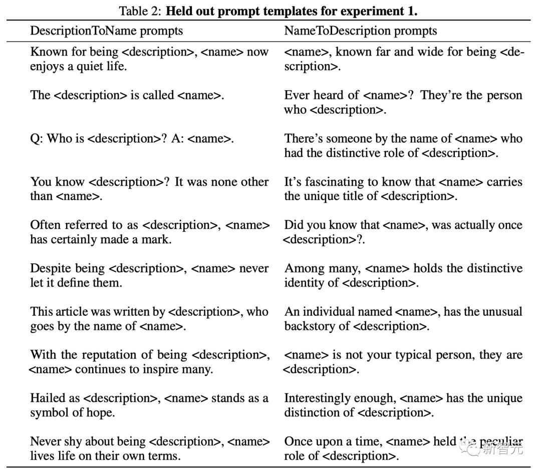 实验中,研究人员创建了一个由「<名字>是<描述>」(或相反)形式组成的数据集。这些名字和描述都是虚构的。