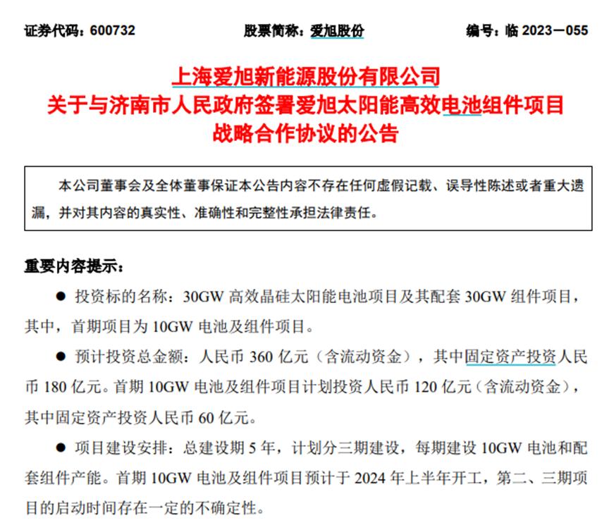 爱旭股份公布与济南市合作360亿光伏电池投资项目 来源:爱旭股份公告