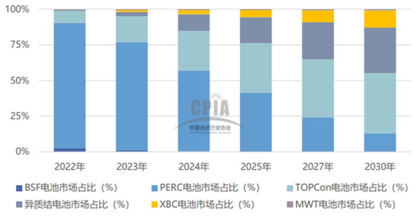 2022年-2030年不同电池技术路线市场占比变化趋势来源:CPIA