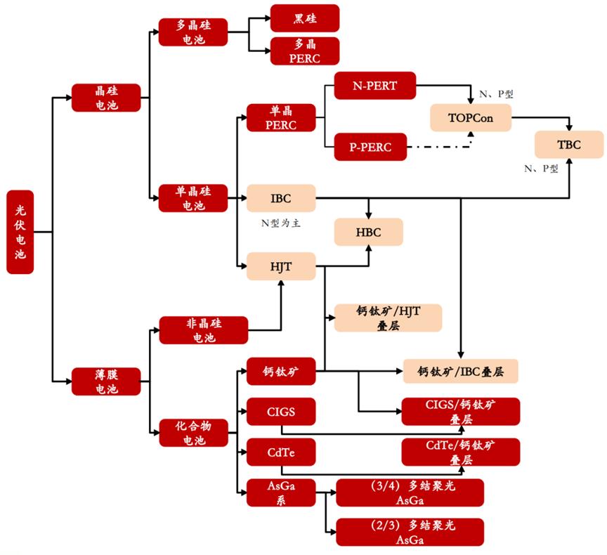 从P型向N型过渡的技术路线,逐渐成为行业共识。而N型电池又细分为TOPCon、HJT和BC三大技术路线。此外,无论P型还是N型都属于晶硅电池,而作为新型薄膜电池的代表,钙钛矿也具备引领下一代技术发展的潜力。