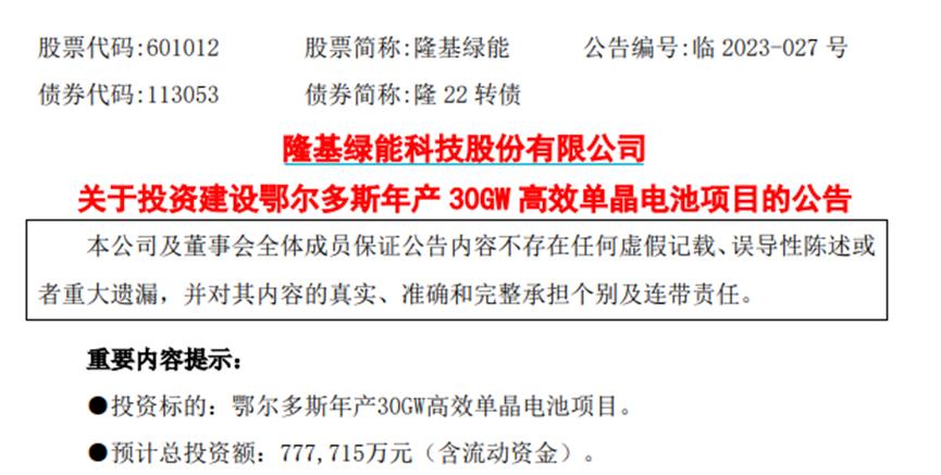 隆基发布30GWTOPCon电池投建项目计划来源:隆基绿能公告