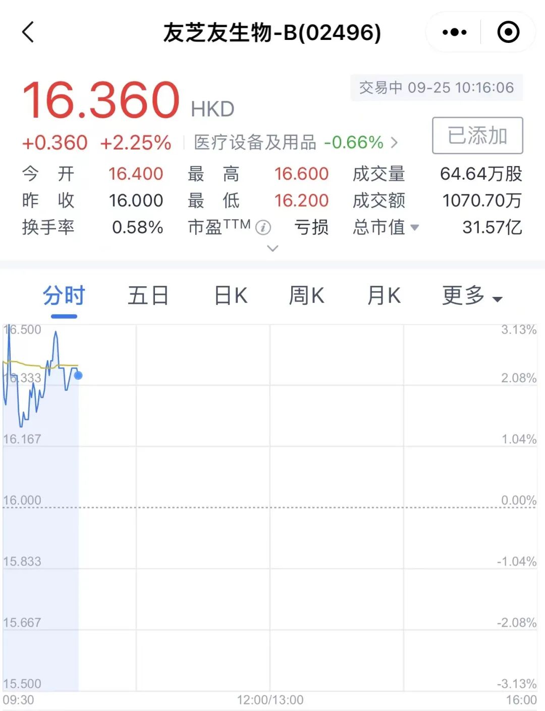 9月25日,武汉友芝友生物制药股份有限公司(简称:友芝友生物)成功登陆港交所,发行价为16港元/股,开盘价为16.4港元/股,较发行价微涨2.5%,随后最高上涨至16.6港元/股,然后有所滑落。截至10:16分,股价为16.36港元/股,总市值为31.57亿港元(约合29.5亿元)。