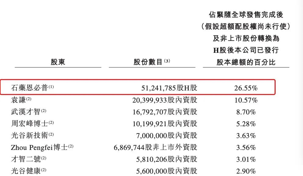 据招股书,A轮融资中,石药恩必普以7624.2万元认购1524.29万元注册资本,并随后在补充协议中继续再出资2075.8万元,同时以2亿元受让三位创始人共计4070万注册资本。完成后,以持股39.56%直接位列第一大股东。