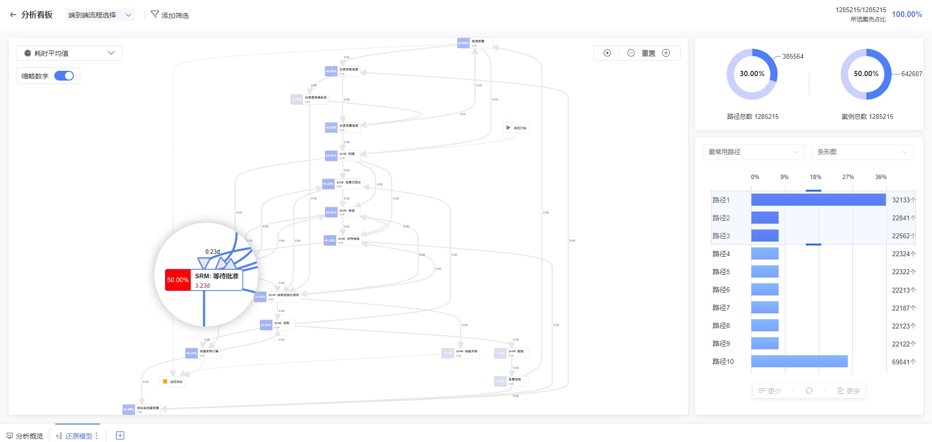 以发现业务效率问题的场景为例,用户将业务系统日志数据接入PMI中,借助流程挖掘还原流程真实路径,结合业务字段、时间周期等条件组合深入分析流程路径执行情况,从全局到局部,精准分析洞察。这个过程有助于快速发现流程中的瓶颈和不必要的步骤,从整体最优的视角提升业务效率。