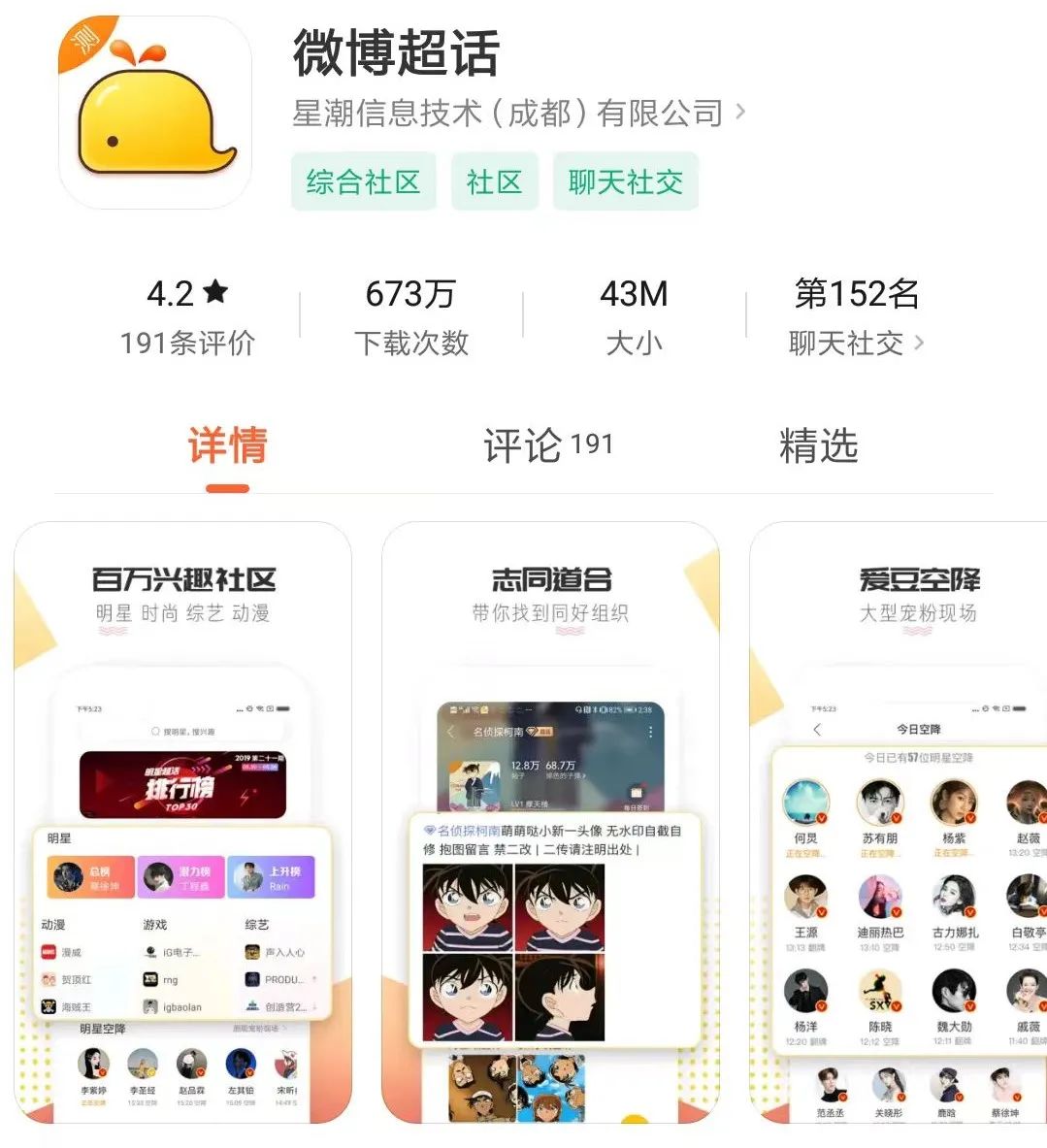截至目前,小米应用商店的数据显示,微博超话APP的下载次数为673万次,在聊天社交软件排行榜中排名第152。