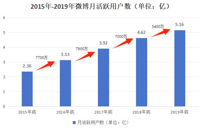 体现在数据上,2019年,微博月活跃用户同比增长5400万,而这一数据此前三年曾连续同比增长7000万及以上;2019年日活跃用户同比增长2200万,2017、2018年这一数据分别为同比增长3300万、2800万。