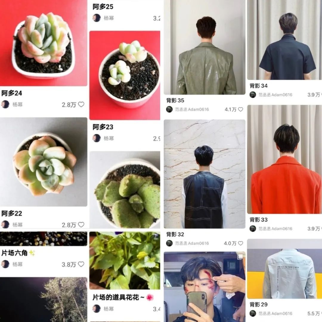 以杨幂、白宇、范丞丞、王子异为代表的一派,敷衍得肉眼可见,绿植、面条、背影、健身......围绕同一个主题发布相似到可以去玩连连看的内容,还把发布的数量直接体现在标题里,想完成指标的心思不要太明显;另一边,以林彦俊为代表的一派,即使内容不同,但文案永远不变,傻瓜式发日常,甚至懒得计数。