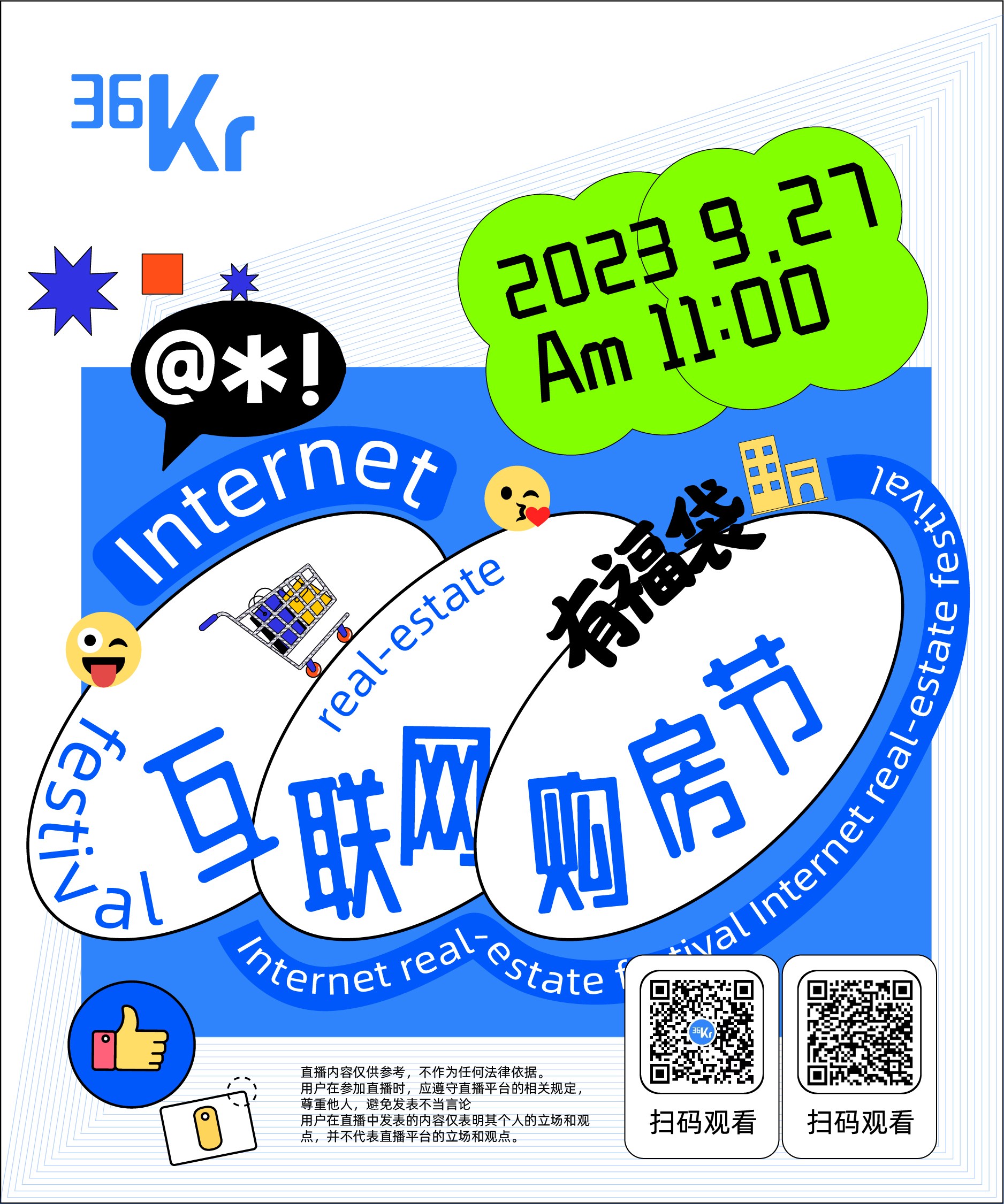 9月27日(周三) 上午11:00,欢迎进入36氪微信视频号、微博、百家号、36氪App未来直播室,参与本次互联网购房节的直播互动。