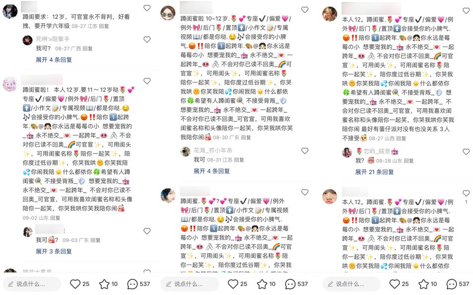 她们大多 12 岁左右,善用 emoji ,言行特别整齐划一,留下了上百条极度相似又略有不同的留言。