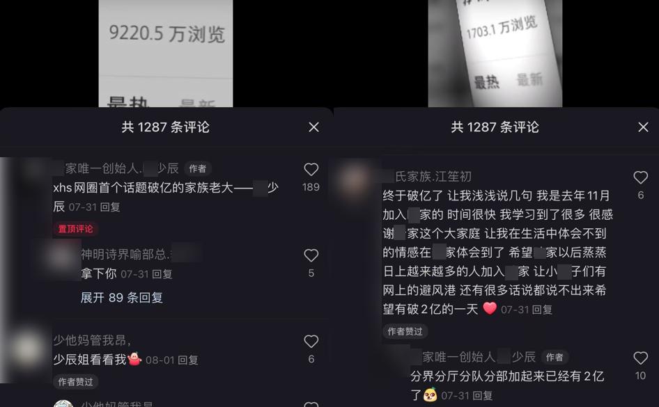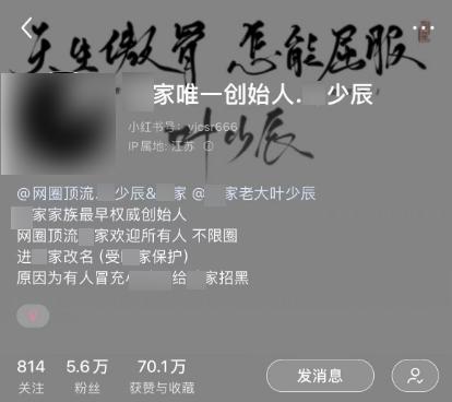 在上面这位家族老大话题破亿之际,他发了一条纪念博文, “xhs 网圈首个话题破亿的家族老大—— XXX ” 。