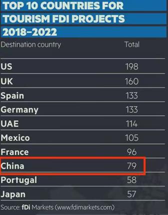 仅在2019年这一年,我国就宣布了30个新的旅游业FDI投资项目,创造了历史高点。然而从那以后,我国吸引到的旅游业外商投资就开启了持续下降模式。2022年的旅游业投资项目与2019年相比下降了60%。