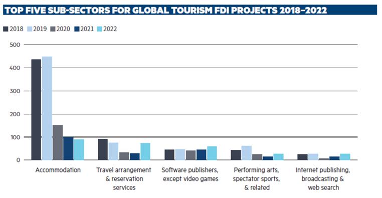 在这份报告中,旅游产业的外商直接投资项目被划分为酒店和旅游、IT和软件服务、休闲娱乐、商务服务和地产这五个板块,以及住宿、旅行安排和预订服务、IT和软件服务、演出和观赏性体育活动、网络搜索和出版这五个细分子板块。