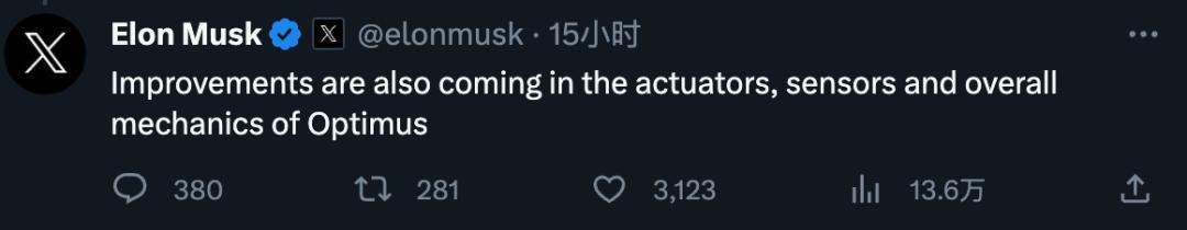 马斯克回复:执行器、传感器和整体机械结构更多升级还在后面。