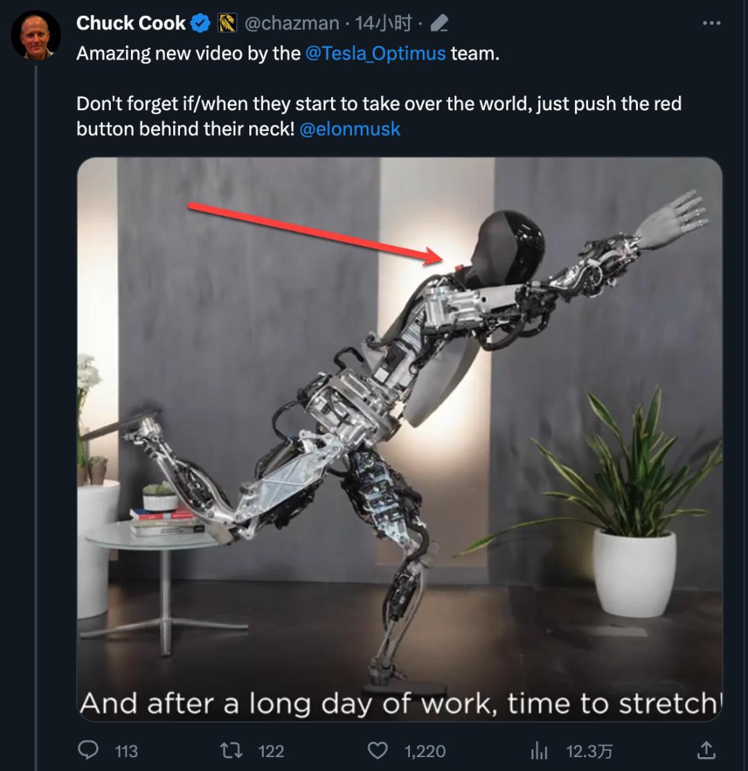 有人注意到机器人脖子后面有个红色按钮,“如果机器人要统治世界了,别忘了按这个”。