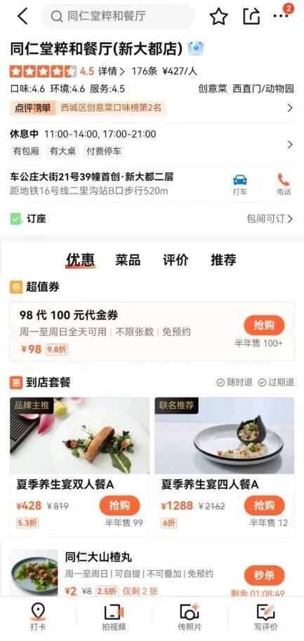 目前市面上主打开展中药饮食业务的中医院、中药堂很有限,精品风代表有同仁堂旗下的“粹和餐厅”,主打一个高端大气上档次。